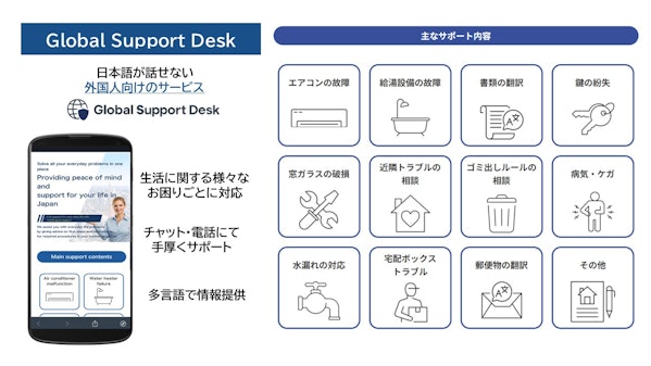Renxa株式会社(読み方:レンサ、東京都豊島区 代表取締役:坂本幸司、以下「当社」)は、業務提携先であるDID-GLOBAL株式会社(本社:大阪市中央区、代表取締役:近藤暁子、以下「DID-GLOBAL」)が運営する外国人専用賃貸DXプラットフォーム「Apartment Japan®(以下「APJ」)」において、当社の多言語生活サポートサービス「Global Support Desk(グローバルサポートデスク、以下「本サービス」)」の提供を新たに開始いたします。