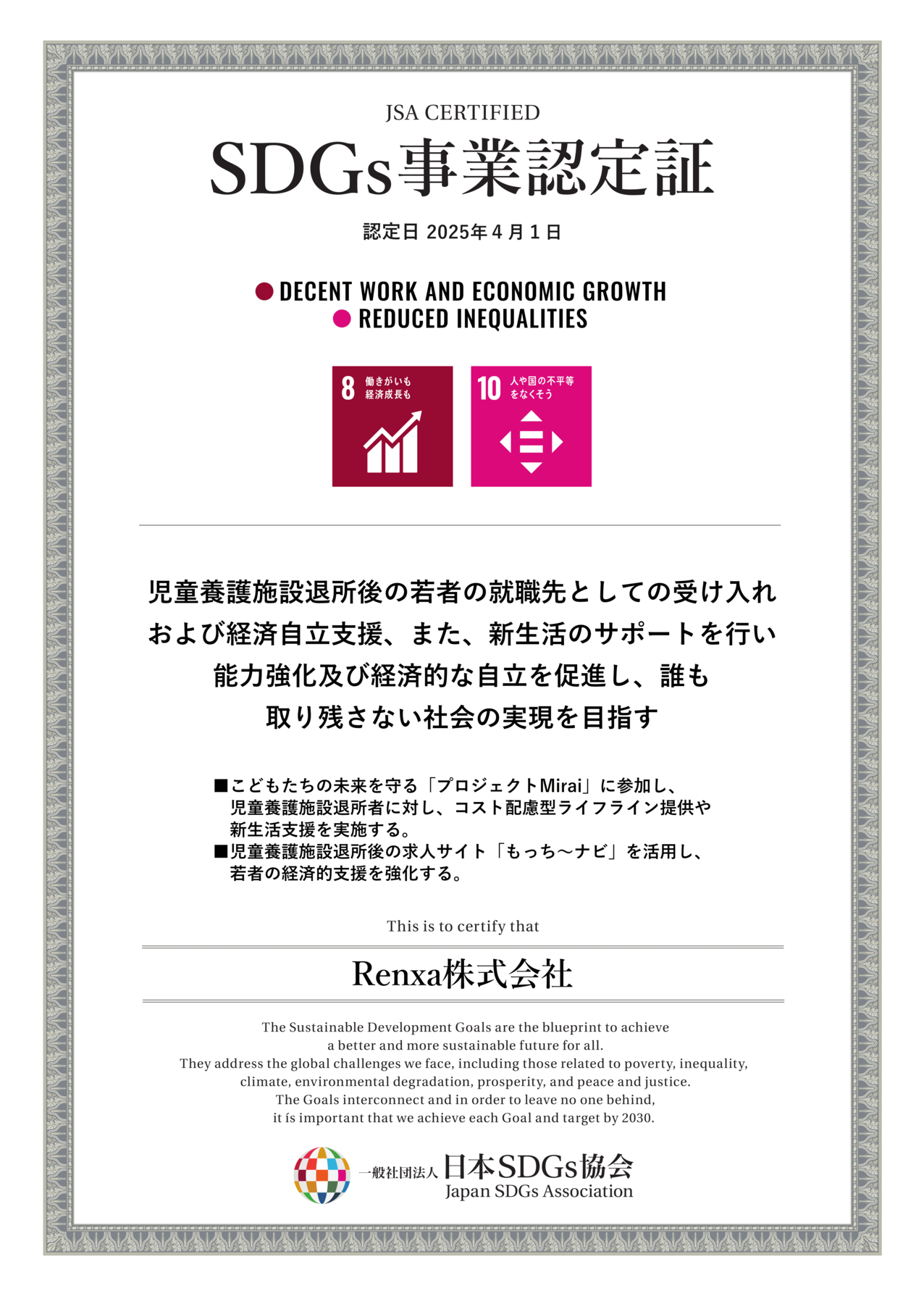 児童養護施設退所後の若者の就職先としての受け入れおよび経済自立支援、また、新生活のサポートを行い能力強化及び経済的な自立を促進し、誰も取り残さない社会の実現を目指す